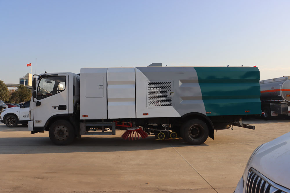 ● 左右側(cè)噴桿V形布置和吸嘴內(nèi)置主噴桿無(wú)間隙高壓噴嘴噴水布置,有效的將清洗后的污水和垃圾全部歸攏趕至吸嘴處,并吸收于污水垃圾箱內(nèi),使路面不留塵土、積水,路面清洗、刷掃和污水回收效果佳。