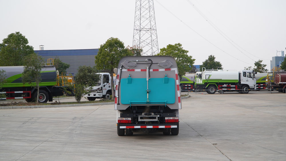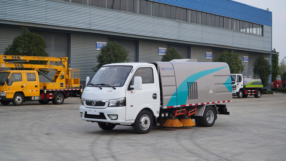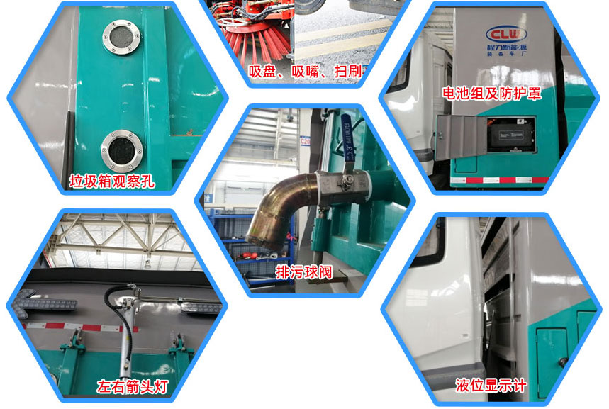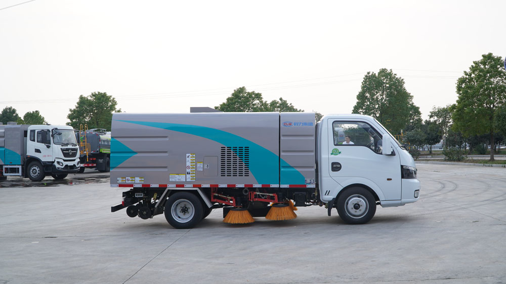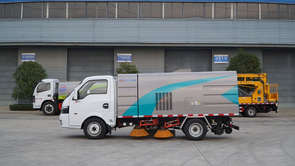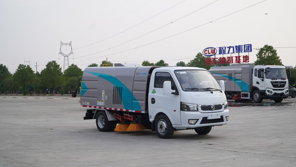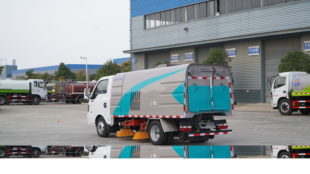 3、掃路車采用東風(fēng)純電動(dòng)二類汽車底盤改裝,加裝風(fēng)機(jī)、清水箱、垃圾箱、左右立掃、帶噴水桿的寬吸嘴、掃盤降塵系統(tǒng)、液壓系統(tǒng)、專用裝置電控系統(tǒng)和副車架等改裝而成。