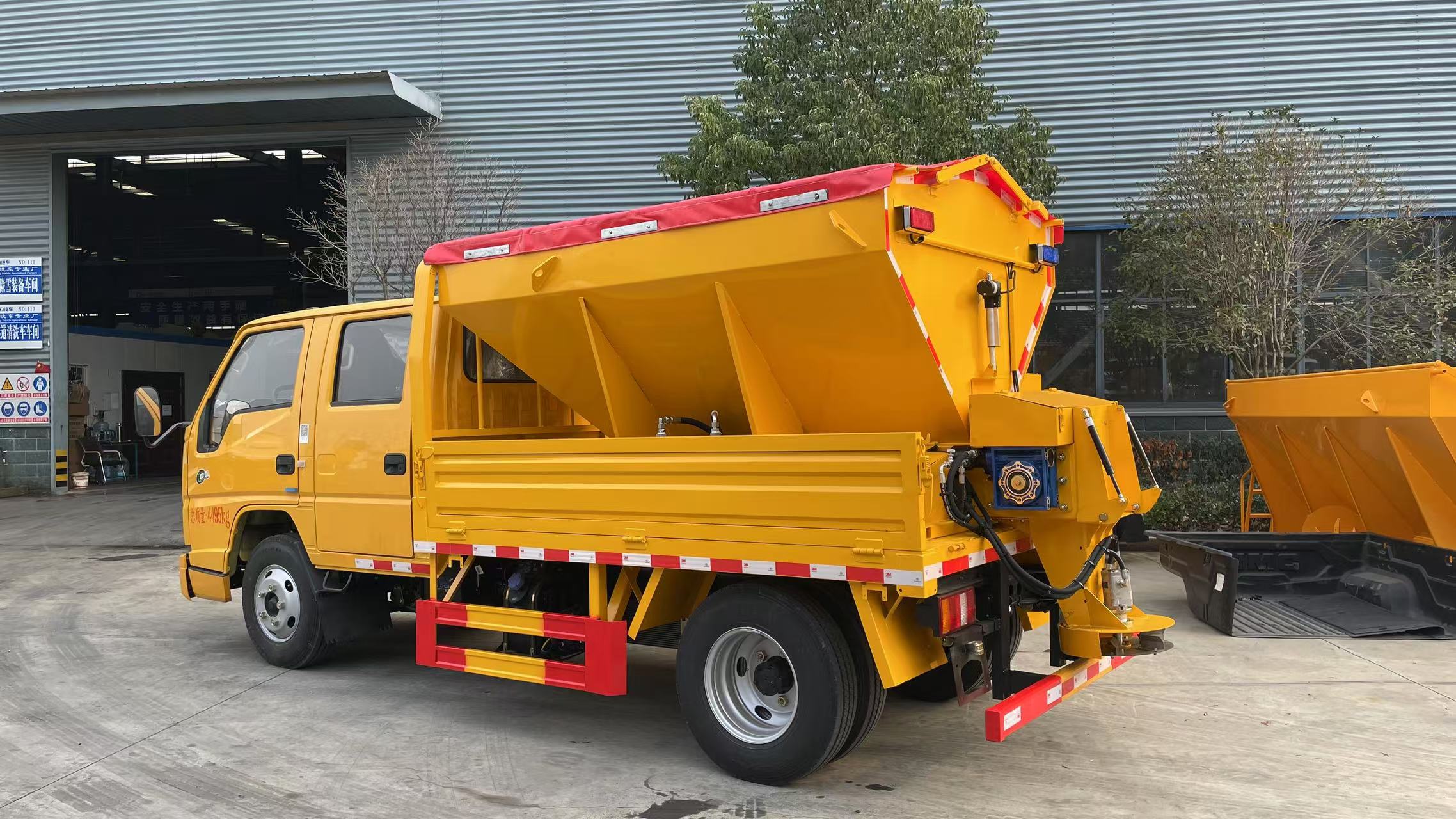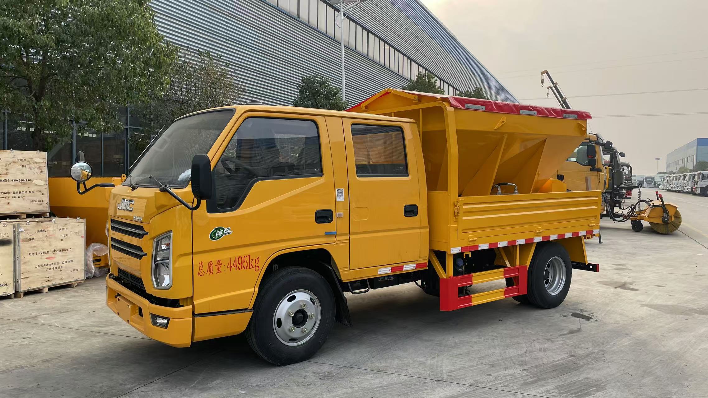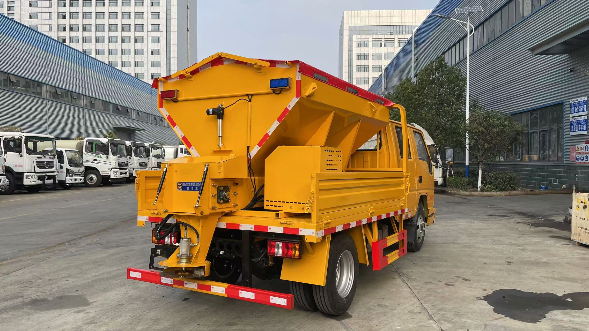 四、其他說明: 該車用于冬季撒布融雪劑,專用裝置為撒布機; 僅選用3360mm軸距底盤; 側后防護材料:Q235,連接方式:左右側及后下部防護均采用焊接連接, 后防護截面尺寸(mm):100×50,下邊緣離地高410mm;