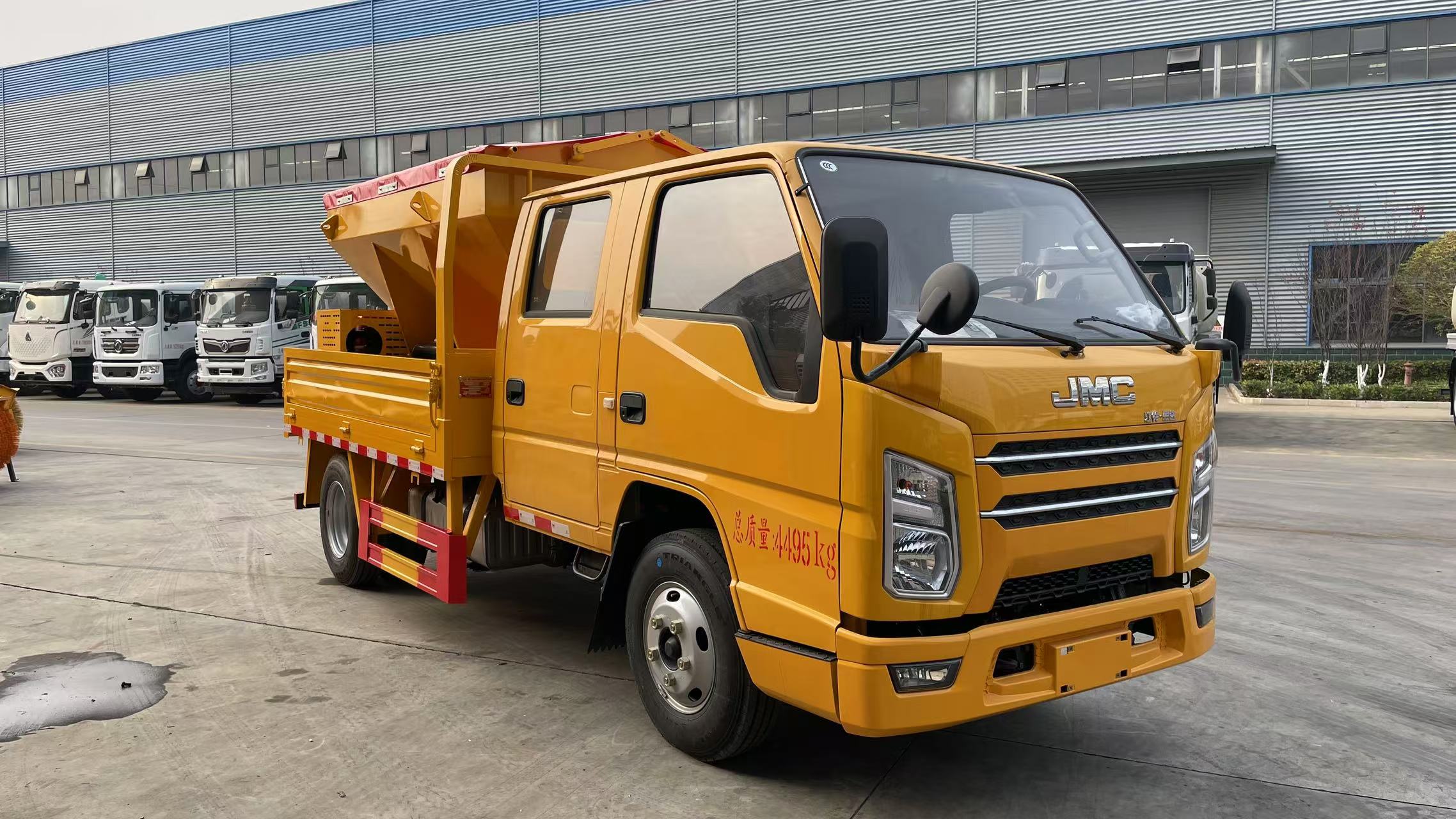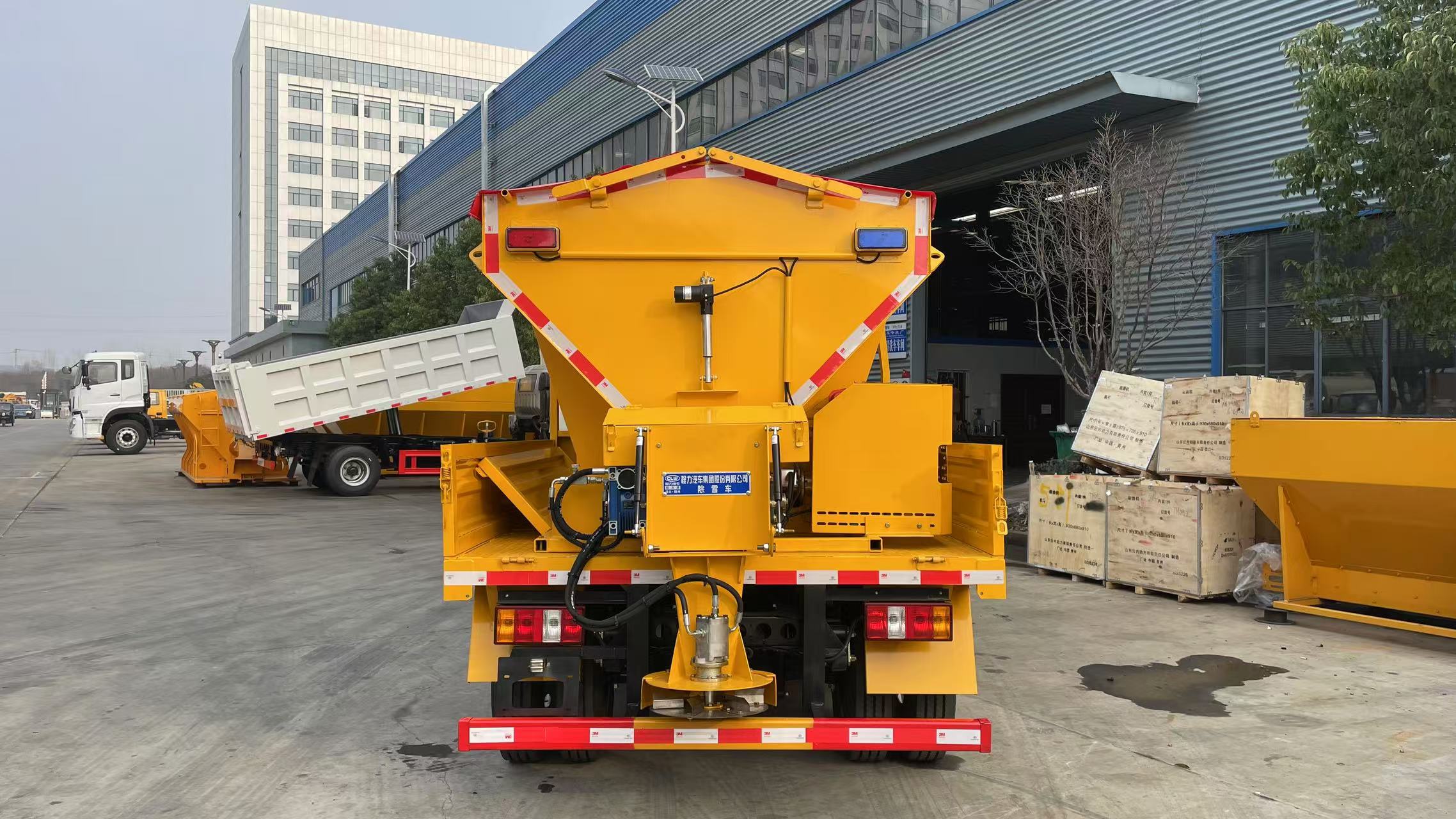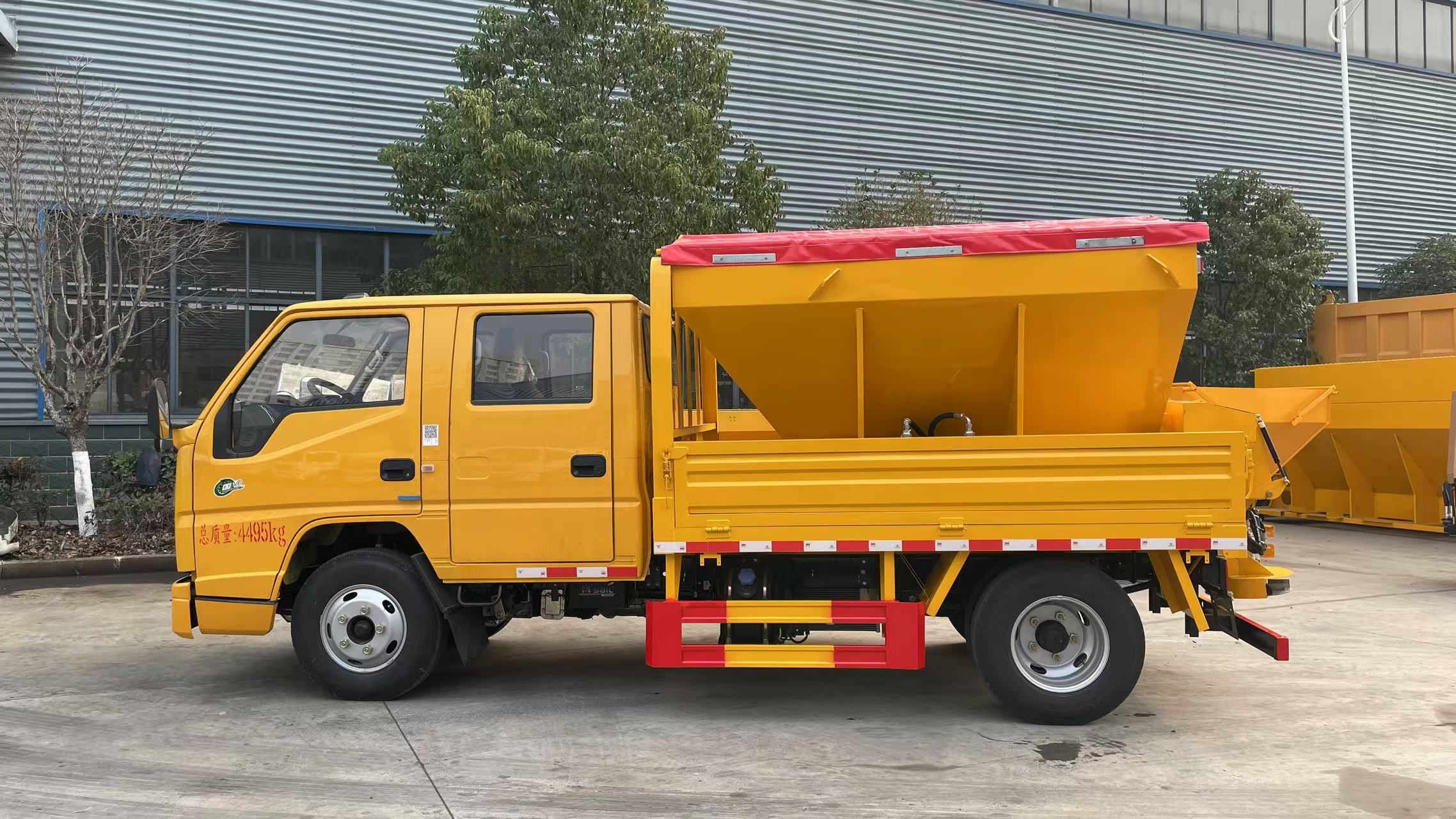 四、其他說明: 該車用于冬季撒布融雪劑,專用裝置為撒布機; 僅選用3360mm軸距底盤; 側后防護材料:Q235,連接方式:左右側及后下部防護均采用焊接連接, 后防護截面尺寸(mm):100×50,下邊緣離地高410mm;
